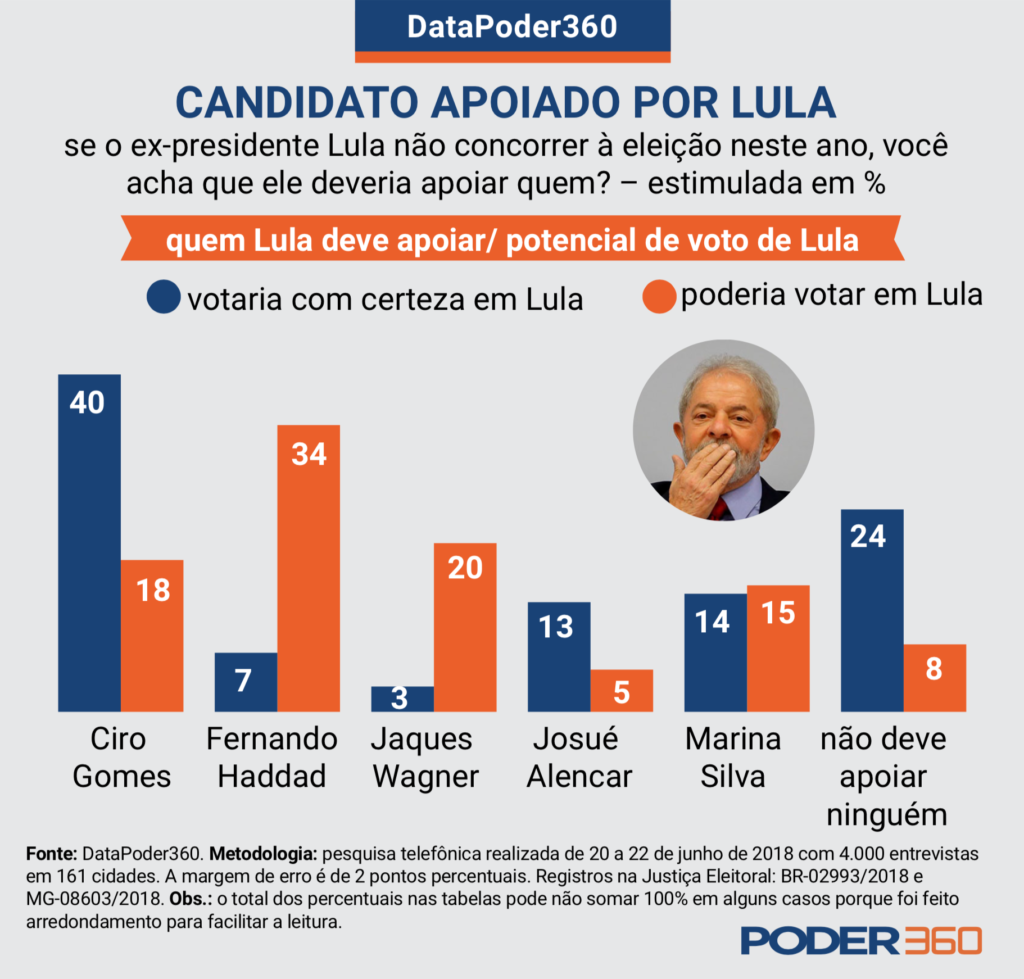 Pesquisa DataPoder360 realizada na semana passada revela que em Minas Gerais 18% dos eleitores simpatizantes de Luiz Inácio Lula da Silva acham que o petista, caso não seja candidato a presidente, deveria apoiar o empresário Josué Alencar. As informações são do site Poder360