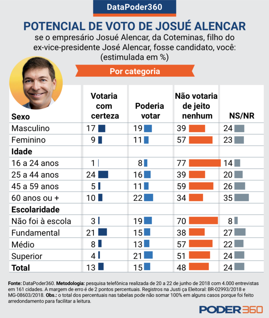 A dúvida de todos é sobre a viabilidade eleitoral de Josué como candidato. Ele é novato, mas não 1 neófito. Já demonstrou apetite político em 2014. Nesse ano, adotou o “nome eleitoral” Josué Alencar (seu nome civil é Josué Alencar Gomes da Silva). Disputou uma vaga para o Senado em Minas Gerais e teve 40,2% dos votos. Perdeu para Antonio Anastasia (PSDB), que teve 56,7%.