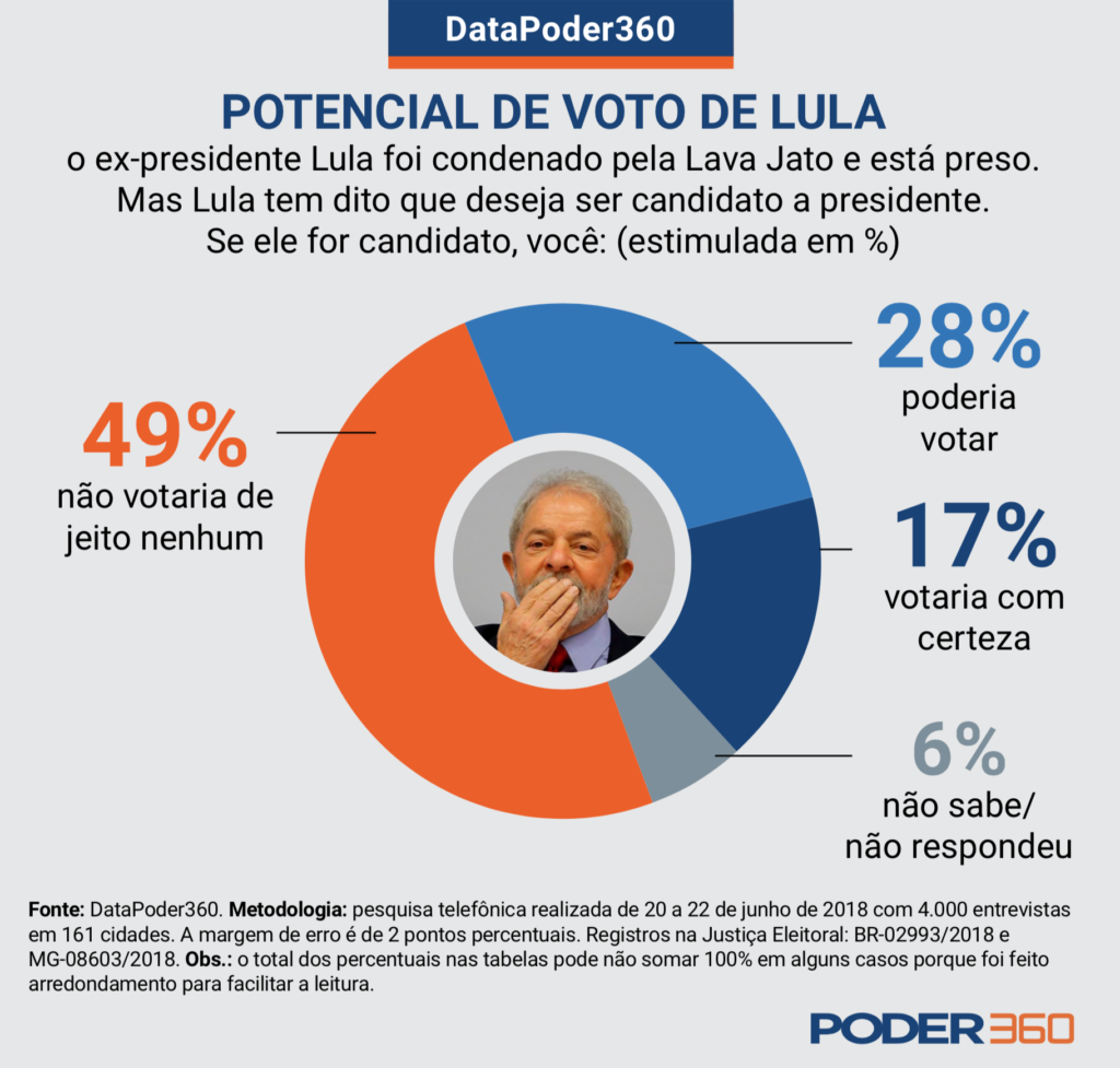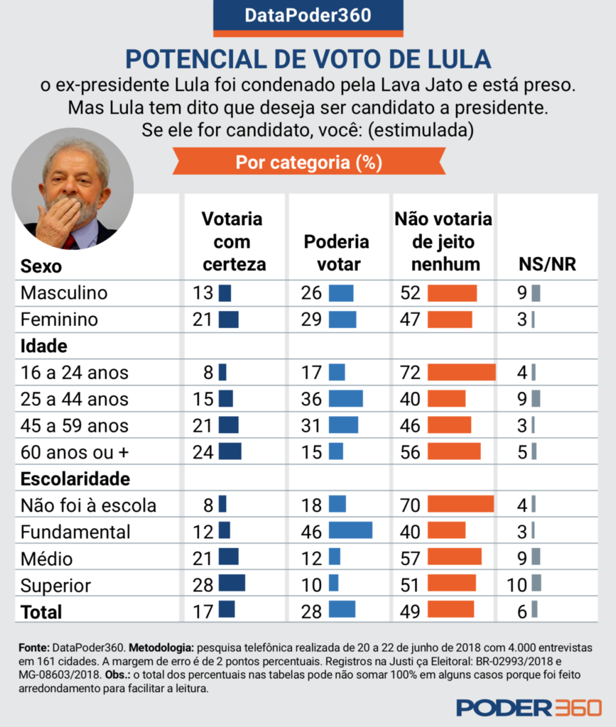 O DataPoder360 trabalha com uma margem de erro preferencialmente inferior a 3 pontos percentuais, para mais ou para menos. Esse percentual pode variar em cada levantamento e os leitores são sempre informados detalhadamente sobre qual foi a metodologia utilizada.