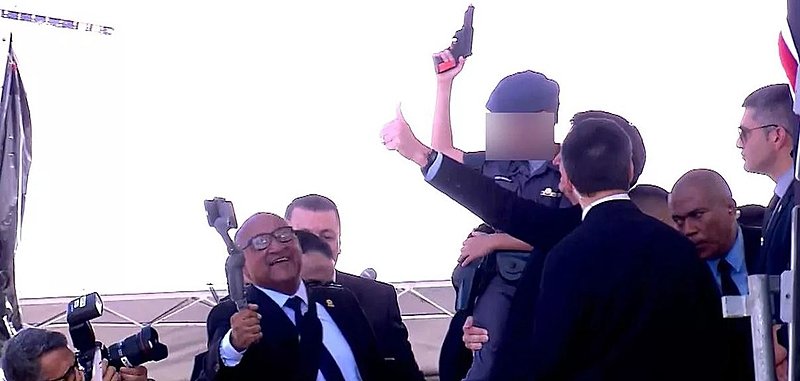 Quando a criança apontou o objeto para o alto, como quem fosse dar um tiro, o presidente fez um sinal de positivo com a mão. Na época, a Secretaria de Segurança Pública do Estado de São Paulo (SSP-SP), emitiu uma nota culpando a segurança de Bolsonaro pelo episódio.