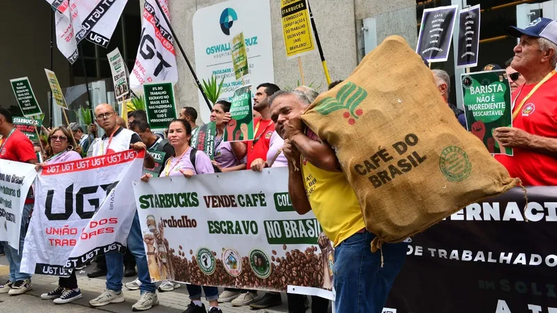Em seguida, o movimento conectou a denúncia brasileira às greves de baristas nos Estados Unidos, criticando um modelo global que prioriza lucros sobre direitos humanos.