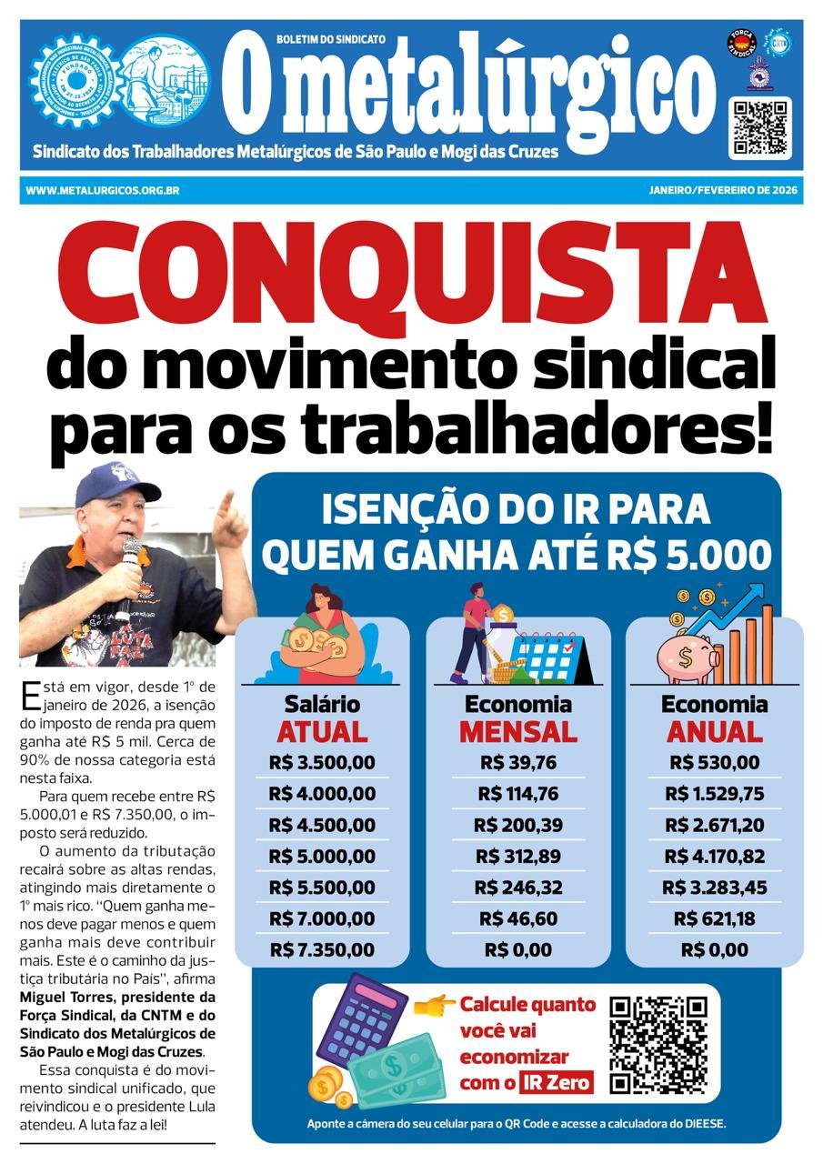 Boletim do Sindicato destaca conquista com a isenção do Imposto de Renda para trabalhadores que ganham até cinco mil reais mensais, fruto da luta sindical.
