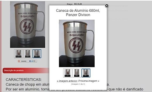 Já nas reproduções abaixo, se vê uma caneca de chopp com o símbolo da SS, as tropas nazistas responsáveis pela cooordenação e manutenção das atividades genocidas nos campos de concentração espalhados por Hitler pela Europa Oriental ao longo da 2ª Guerra Mundial (1939-45).