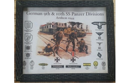Quadro com cena de batalha da 2ª Guerra e insígnias nazistas, à venda na loja Panzer Militaria/ Reprodução