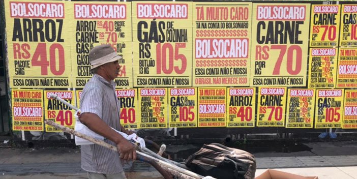 A campanha, batizada de “Bolsocaro”, tem cartazes, no formato daqueles conhecidos lambe-lambes, nas cores amarelo e vermelha, como os das promoções de supermercados, só que ao invés de preços baixos, bate nos preços extorsivos que a população está pagando pelo arroz, pela carne, gás de cozinha, gasolina e produtos da cesta básica em geral.