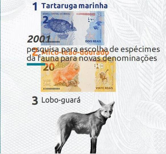 O lobo-guará foi escolhido em pesquisa realizada pelo BC em 2001 para eleger quais espécies da fauna brasileira deveriam ser estampadas nas cédulas do país.
