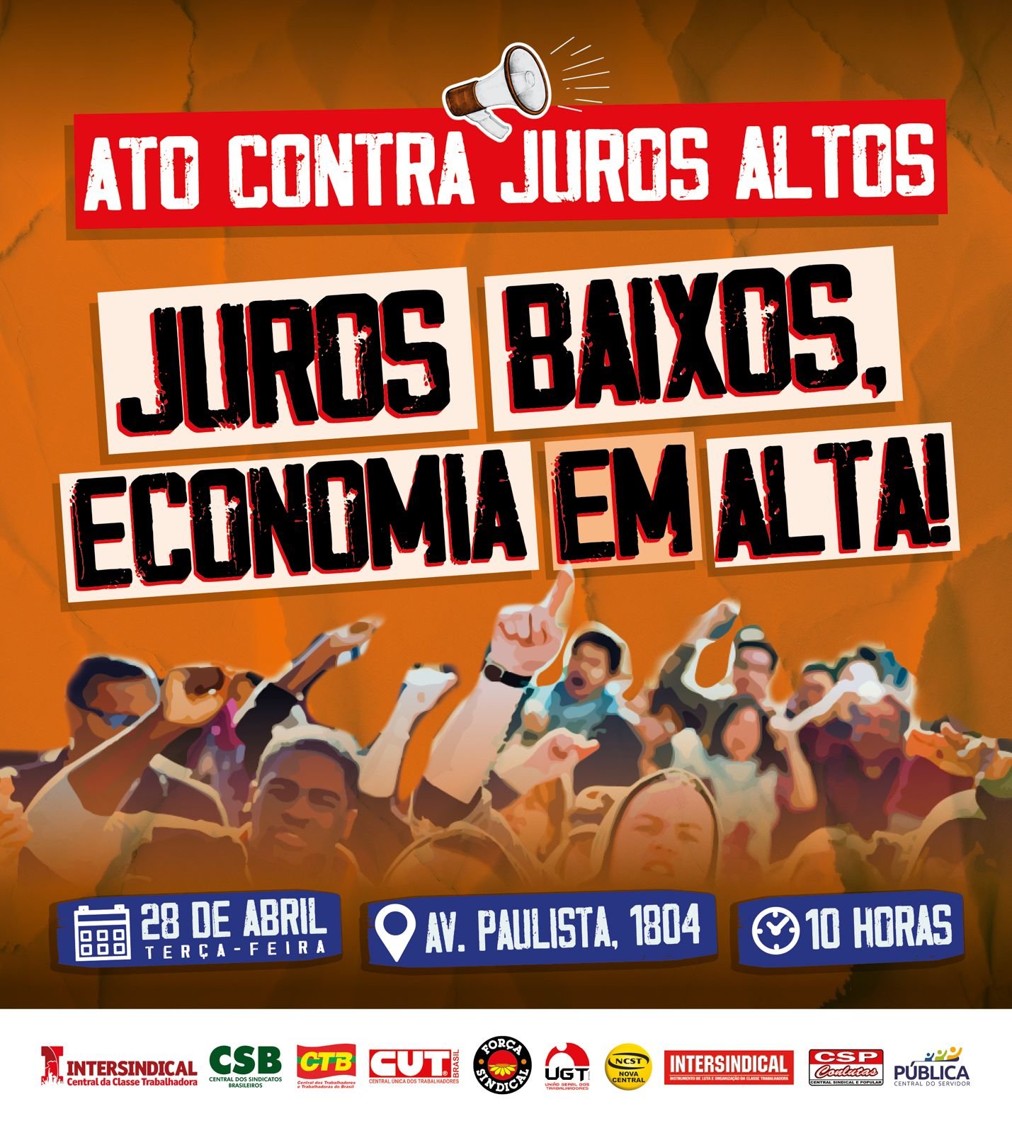 As centrais sindicais convocam ato unificado contra juros altos na próxima terça-feira, 28 de abril, em São Paulo. A mobilização ocorrerá diante do Banco Central, na Avenida Paulista, nº 1804.