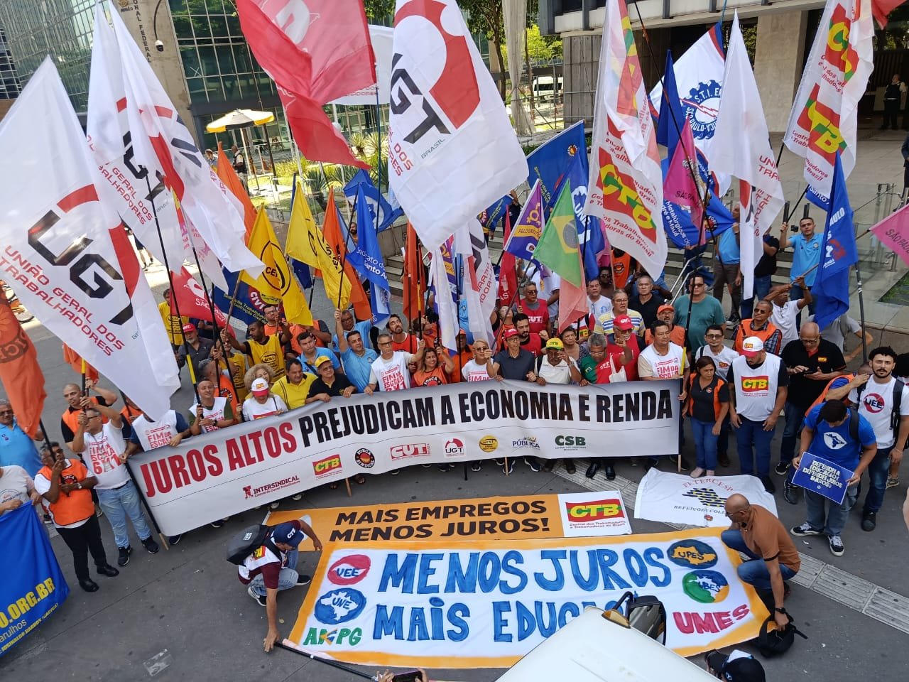Dirigentes e militantes das centrais sindicais realizaram, nesta terça-feira (17), manifestação em frente ao Banco Central, em SP, para exigir redução imediata da taxa Selic. O ato também contou com a participação de representantes da UNE (União Nacional dos Estudantes).