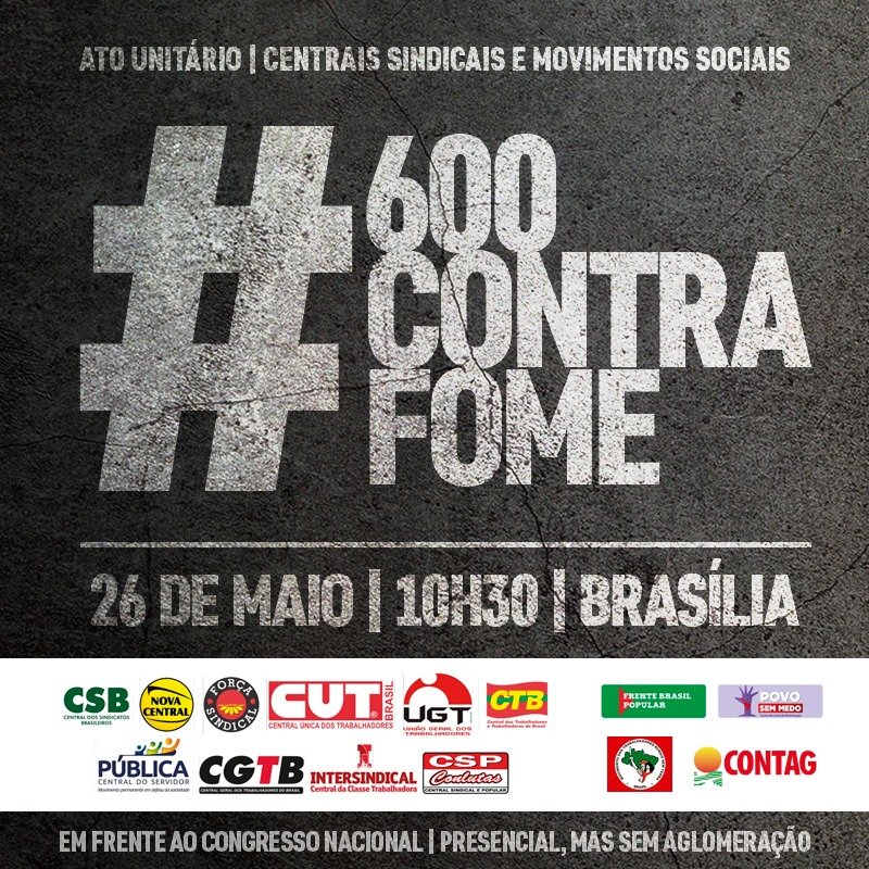 CUT, Força Sindical, UGT, CTB, Nova Central, CSB, Intersindical, Pública, CSP-Conlutas, CGTB, CONTAG, MST e Frentes Brasil Popular e Povo Sem Medo organizaram o ato 26M em defesa do auxílio emergencial de R$ 600,00, contra a fome e a carestia, por vacina no braço e comida no prato. Também ratearam o custo das doações de três toneladas de alimentos agroecológicos a trabalhadores cooperativados. A mobilização terá as presenças e falas dos presidentes nacionais das centrais sindicais e das lideranças dos movimentos sociais, além de parlamentares. Todos falarão do alto de um caminhão de som, voltados ao Parlamento.