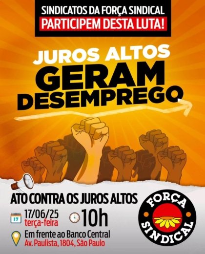 A Força Sindical, CUT, UGT, CTB, CSB e Nova Central Sindical, realizarão amanhã (17 de junho) ato cobrando do Banco Central a redução na Taxa Selic, que esta em 14,75% a.a Durante o ato, sindicalistas farão ironias com a “quadrilha dos especuladores” na av. Paulista.