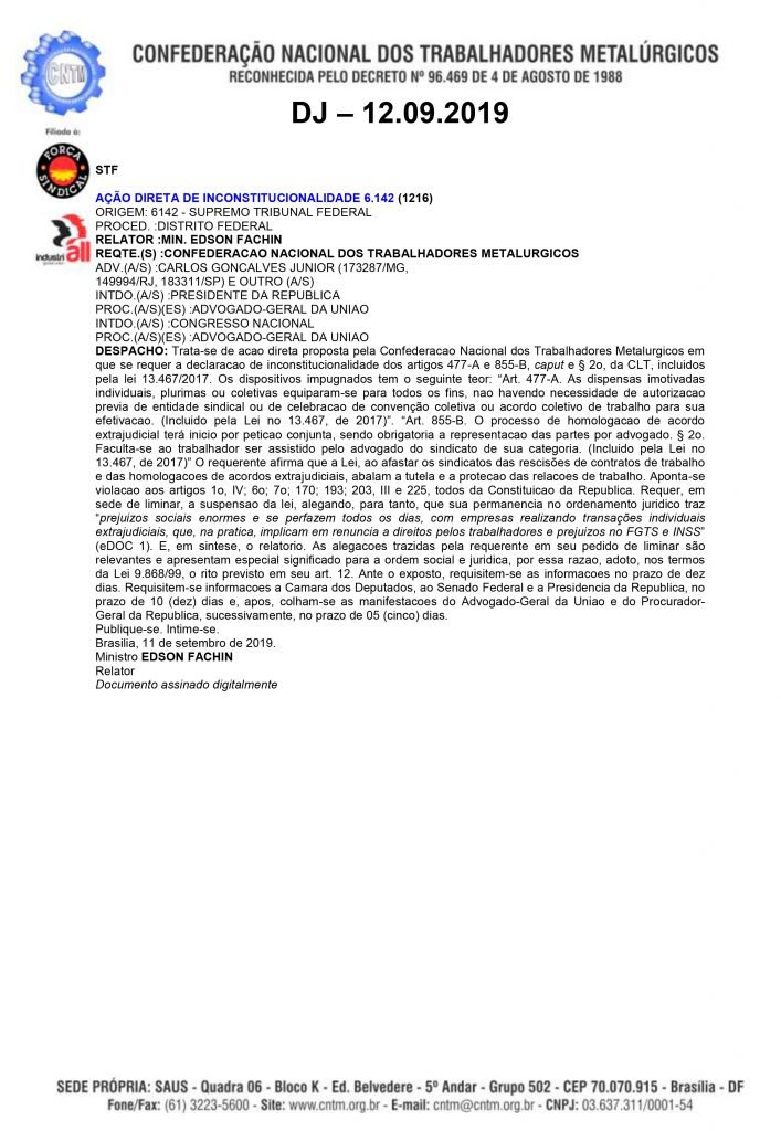 O ministro Edson Fachin, relator da ADIN da CNTM, inclusive já solicitou o encaminhamento da mesma para o pleno do STF pedindo urgência na matéria, pela relevância da questão.
