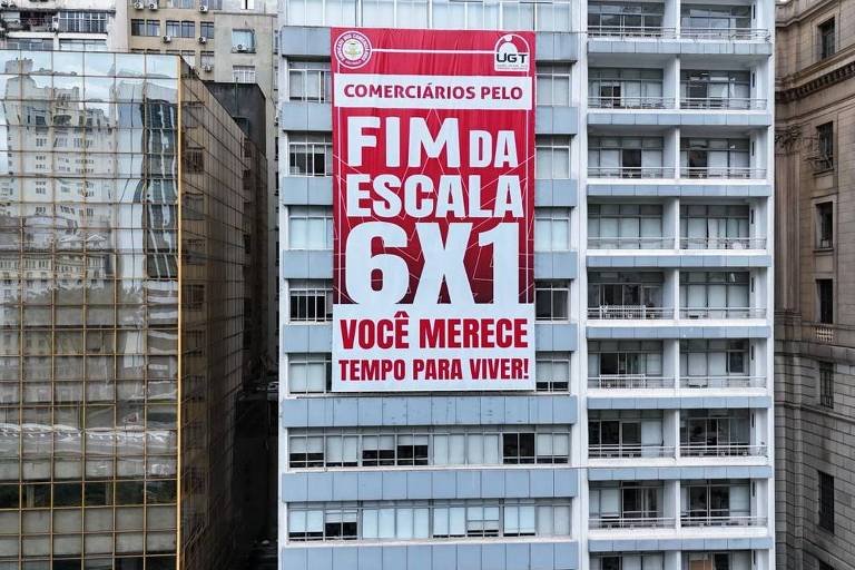 O Sindicato dos Comerciários de São Paulo estendeu um cartaz em sua sede pedindo o fim da escala 6X1. Foto: reprodução.