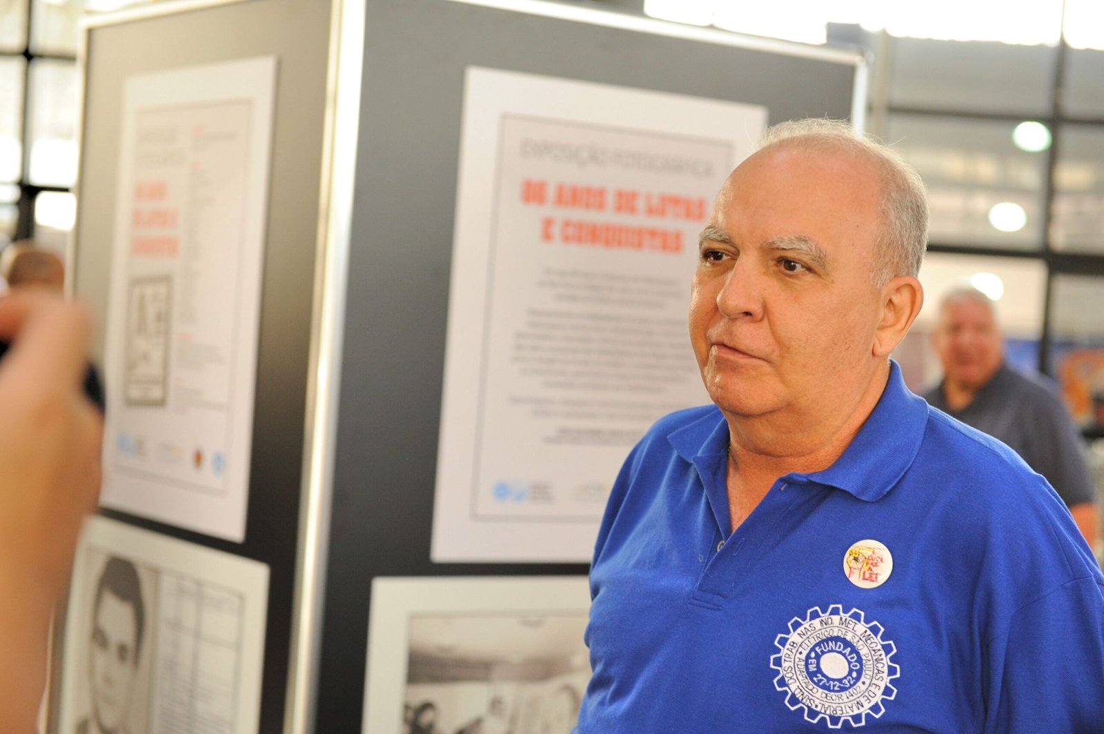 Miguel Torres na exposição sobre a história do Sindicato dos Metalúrgicos de São Paulo. Atrás, um painel com foto de Manoel Fiel Filho