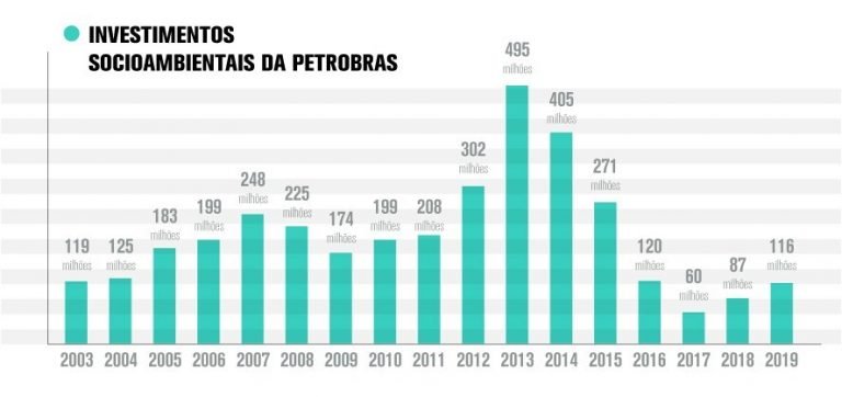 Entre 2016 e 2019, de acordo com levantamento realizado pelo Departamento Intersindical de Estatística e Estudos Socioeconômicos (Dieese), o valor investido pela Petrobras em projetos socioambientais foi de R$ 383 milhões. É uma redução de 73,9% em relação à quantia de R$ 1,47 bilhão investido nos quatro anos anteriores, entre 2012 e 2015.