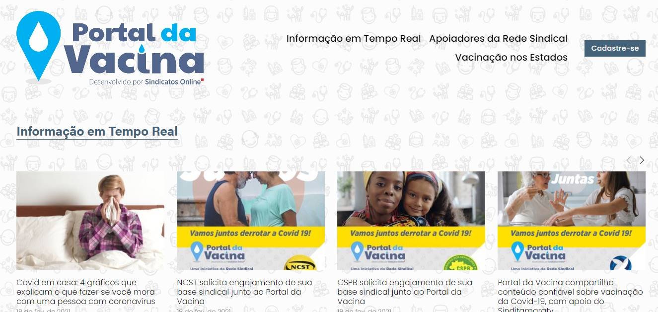 O Portal da Vacina, desenvolvido pelo Sindicatos Online tem como objetivo fortalecer a luta contra a Covid-19 que já vitimou milhares de pessoas no Brasil e em todo o mundo. É um site de utilidade pública e de iniciativa das Entidades Sindicais e da sociedade civil que visa fortalecer a luta para a imunização da população.