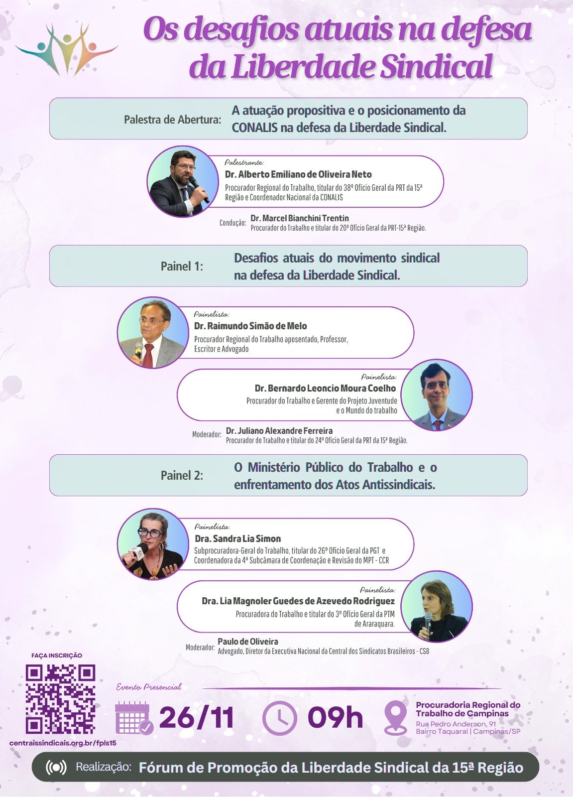 O evento ocorrerá presencialmente, às nove horas, na Procuradoria Regional do Trabalho em Campinas, com inscrições disponíveis pelo link: centraissindicais.org.br/fpls15.