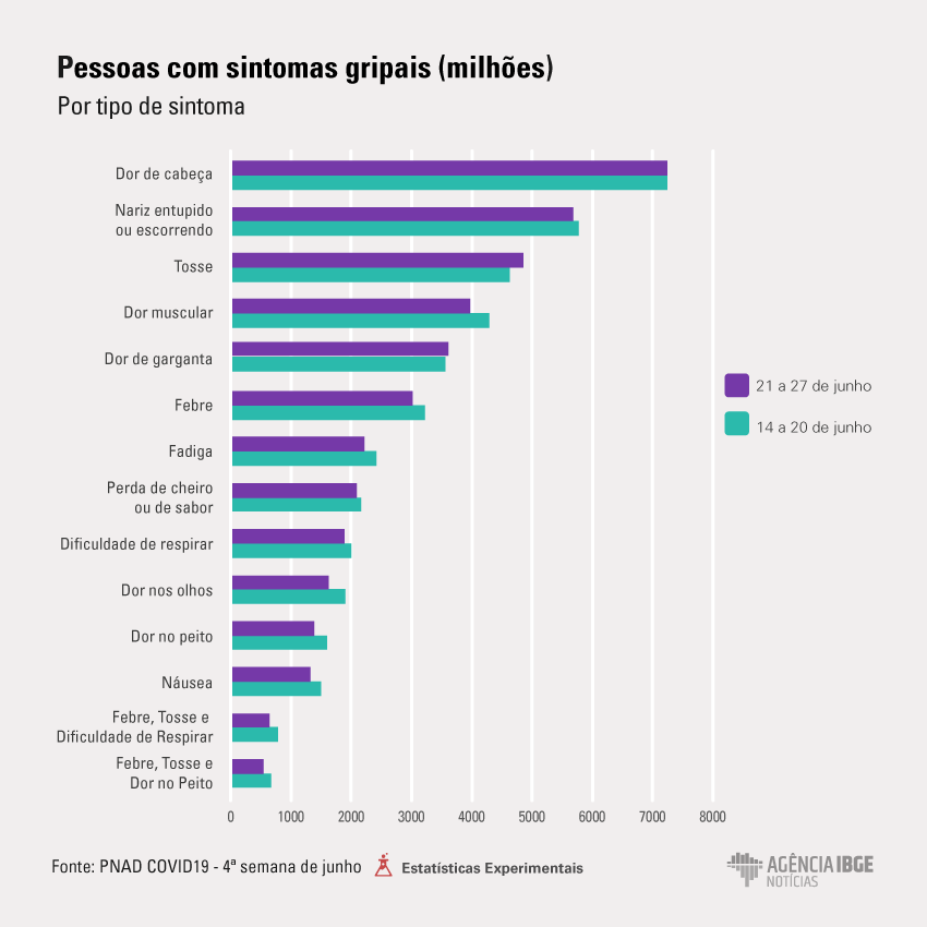 A maioria dos sintomas também ficou estável na quarta semana de junho, frente à anterior, com exceção de dor nos olhos, cujas queixas caíram de 1,9 milhão para 1,6 milhão. Dor de cabeça foi a mais relatada (7,2 milhões), seguida por nariz entupido ou escorrendo (5,7 milhões), tosse (4,8 milhões), dor muscular (4 milhões), dor de garganta (3,6 milhões), fadiga (2,2 milhões), perda de cheiro ou de sabor (2 milhões) e dificuldade de respirar (1,9 milhão).