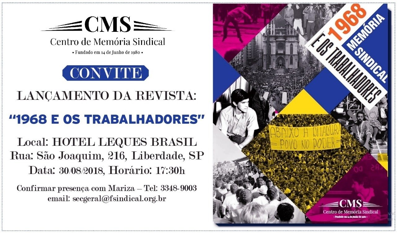 “1968 e os trabalhadores” é o nome da revista que o Centro de Memória Sindical lançará no dia 30 de agosto, às 17h30, no Hotel Leques Brasil, no bairro da Liberdade, em São Paulo. O ex-ministro da Casa Civil do governo Lula, José Dirceu, e Aldo Rebelo, chefe da Casa Civil do governo de São Paulo confirmaram presença no evento.