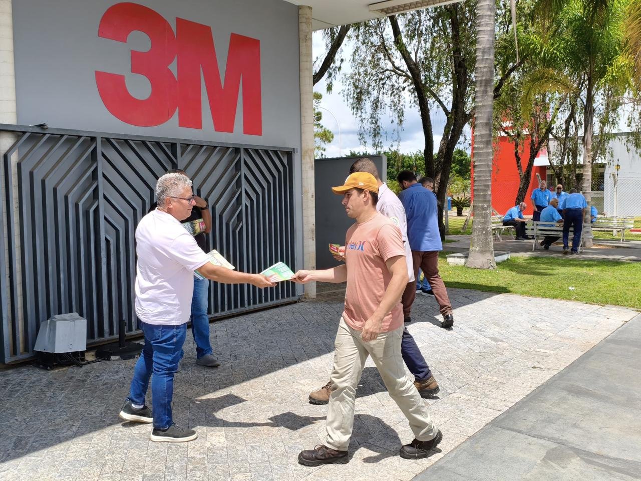 Dirigentes sindicais do setor químico entregaram o panfleto criado pelas centrais sindicais na fábrica 3M do Brasil, destacando a isenção do Imposto de Renda até R$ 5 mil e a correção progressiva até R$ 7.350 mensais.
