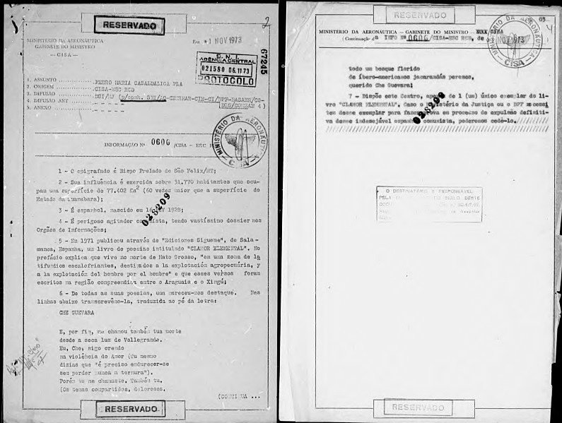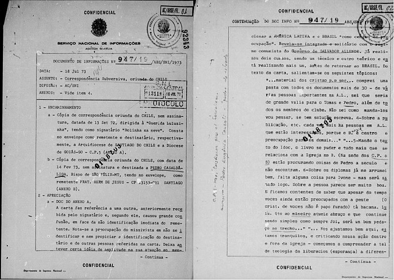 A menção ao bispo, conhecido pela sua luta ao lado de camponeses que resistiam aos grandes latifúndios patrocinados pela ditadura, é uma das mais de mil citações a Casaldáliga em relatórios do Serviço Nacional de Informações (SNI), abertos para consulta em 2005, durante o governo de Luiz Inácio Lula da Silva.