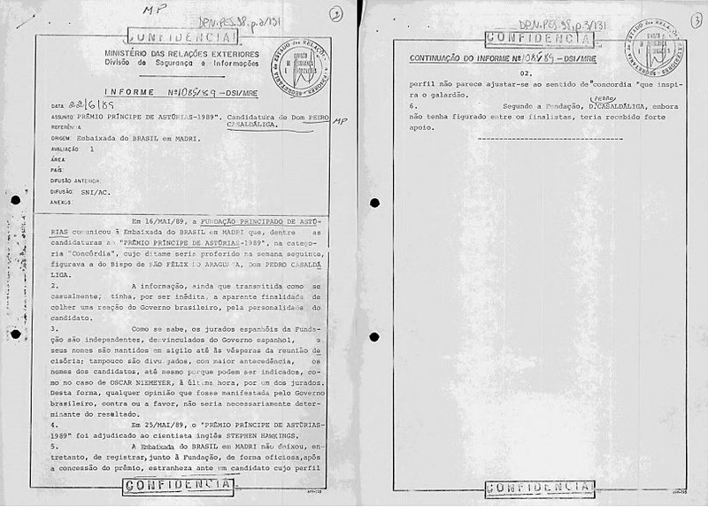 Um relatório mais recente do SNI também chama atenção. Em 1989, quando a ditadura já havia acabado, Casaldáliga foi indicado para o prêmio espanhol Príncipe das Astúrias, instituído por um herdeiro do trono espanhol. Na ocasião, a embaixada brasileira em Madri foi informada da indicação.