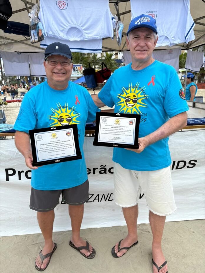 Em comemoração aos 30 anos do Projeto Verão sem AIDS – Valorizando a Vida, Serginho, em nome de toda a diretoria da FEQUIMFAR e João Scaboli foram homenageados com placas de reconhecimento pela dedicação e compromisso na luta pela conscientização, prevenção e combate ao preconceito em relação ao HIV/AIDS.
