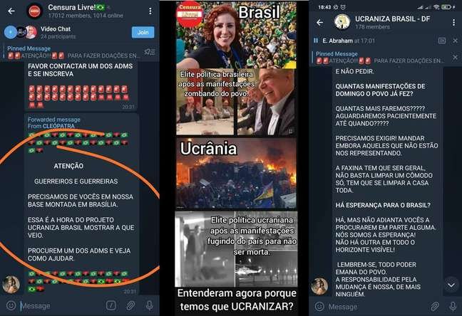 A convocação é feita por grupos no Telegram, que têm administradores anônimos. O grupo principal, “Ucraniza Brasil DF”, específico para o acampamento em Brasília, tem 180 membros. Há um outro, geral, com mais de 17 mil pessoas. Os administradores fazem convocações e ameaças constantemente: “Precisamos de vocês em nossa base montada em Brasília. Essa é a hora do projeto Ucraniza Brasil mostrar a que veio”.