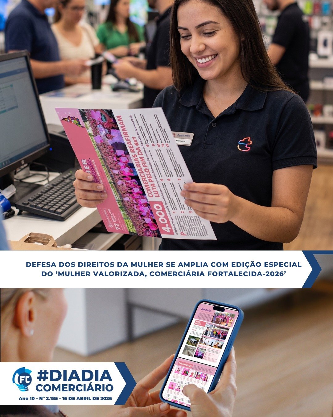 Diferenciada, a fim de mostrar a grandeza do evento realizado com quatro mil comerciárias, a capa estampa a foto da aprovação das 12 deliberações no formato horizontal. A cor rosa dá um toque ainda mais feminino à edição, que traz como manchete: “4.000 COMERCIÁRIAS REAFIRMAM LUTA PELO FIM DA 6X1”.