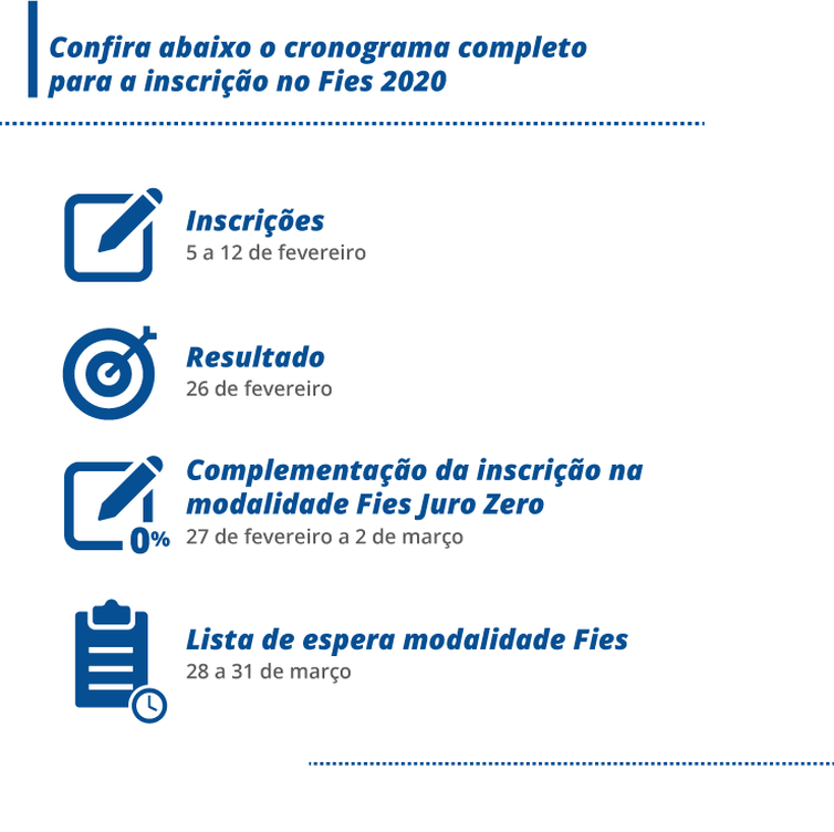 Na modalidade Fies, o estudante deve complementar a inscrição pelo site do programa no período de 27 de fevereiro a 2 de março. Já os pré-selecionados na modalidade P-Fies deverão comparecer à instituição de ensino para validação das informações de sua inscrição e contratação do financiamento.