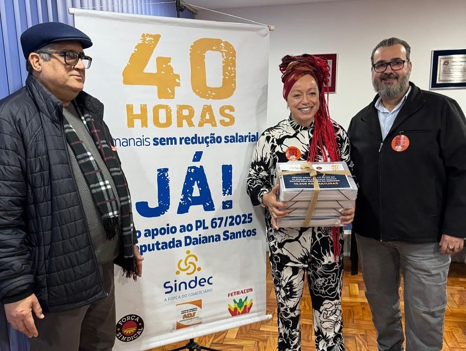 Na tarde desta segunda, 7 de julho, o Sindec deu mais um passo importante na luta pela redução da jornada de trabalho para 40 horas semanais, com a entrega de 10.249 assinaturas do abaixo-assinado em apoio ao PL 67/2025, de autoria da deputada federal Daiana Santos (PCdoB-RS).