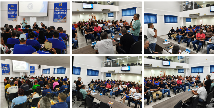 Durante a abertura, participaram Serginho, presidente da FEQUIMFAR, Edson Dias Bicalho, secretário geral, e Jurandir Pedro de Souza, diretor financeiro, reforçando unidade, diálogo contínuo e compromisso institucional.
