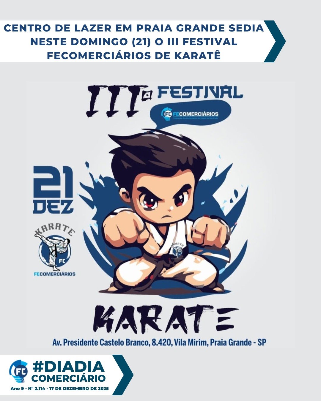 No próximo domingo, 21, acontecerá o III Festival Fecomerciários de Karatê, promovido pelo Programa de Iniciação Esportiva Fecomerciários de Karatê no Centro de Lazer em Praia Grande.