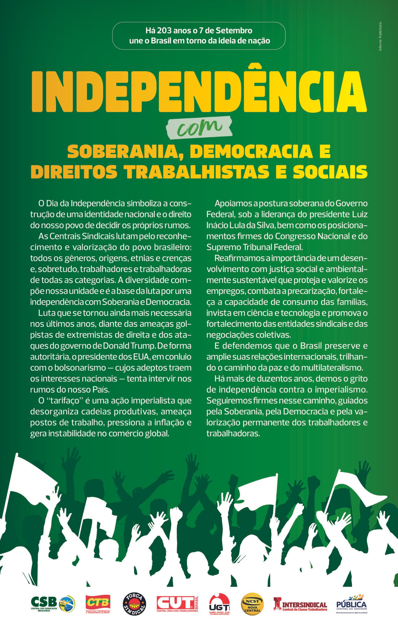 As Centrais Sindicais lutam pelo reconhecimento e valorização do povo brasileiro: todos os gêneros, origens, etnias e crenças e, sobretudo, trabalhadores e trabalhadoras de todas as categorias. A diversidade compõe nossa unidade e é a base da luta por uma independência com soberania e democracia.