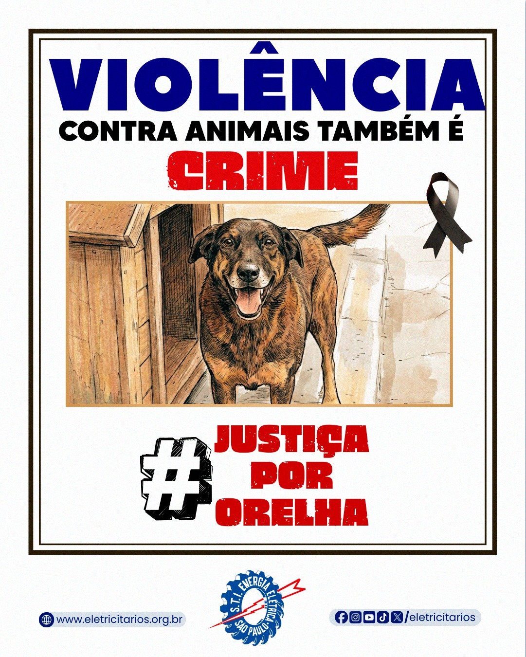 O Sindicato dos Eletricitários de São Paulo manifestou publicamente, em suas redes sociais, solidariedade aos animais e repúdio à violência praticada contra o cão Orelha. As postagens integram uma mobilização nacional que denuncia os maus-tratos, cobra responsabilização dos culpados pela violência que vitimou o cão comunitário da Praia Brava, em Florianópolis (SC) no dia 5 de janeiro, e reafirma que nenhuma forma de violência pode ser normalizada.