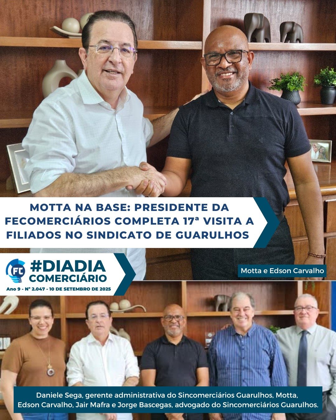 O presidente da Fecomerciários, Luiz Carlos Motta, foi recepcionado pelo presidente do Sincomerciários de Guarulhos, Edson Carvalho, na última terça-feira, 9, para a realização de mais uma reunião da série de encontros que o líder estadual vem realizando na base sindical comerciária paulista.