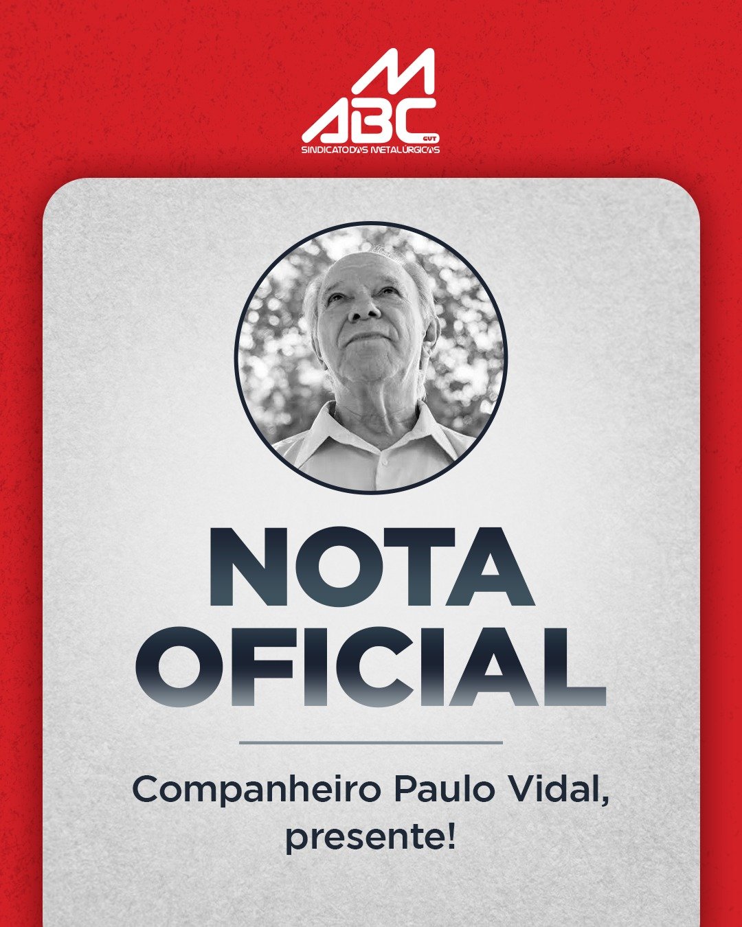 A direção do Sindicato dos Metalúrgicos do ABC recebeu nesta segunda-feira (02), com profundo pesar, a notícia do falecimento de Paulo Vidal, aos 83 anos.