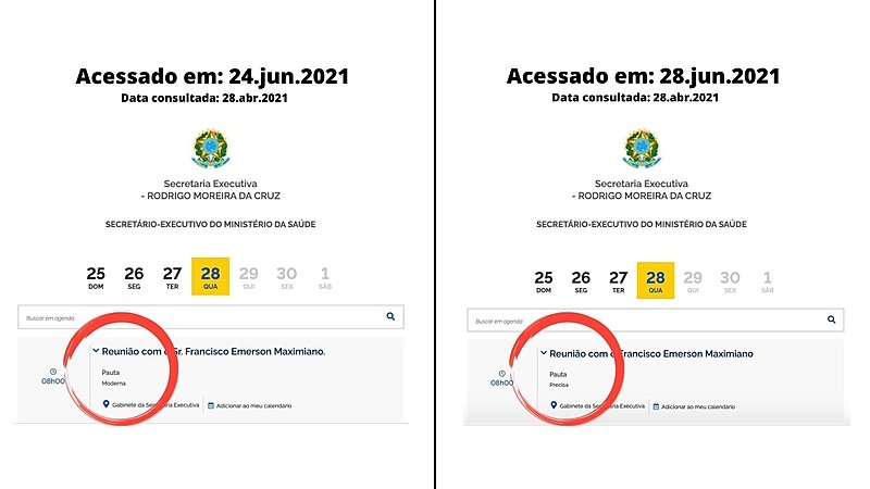 Agenda do secretário-executivo do Ministério da Saúde em 28 de abril pré e pós-alteração. Pasta disse ter cometido “erro administrativo” / Reprodução/Ministério da Saúde