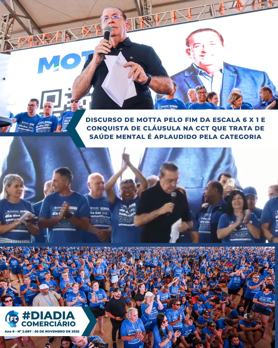 O posicionamento unitário da Fecomerciários e seus 72 Sindicatos Filiados pelo fim da escala 6 x 1, e que rendeu efusivos aplausos ao presidente Luiz Carlos Motta durante o seu discurso na nona edição do Dia dos Comerciários (26 de outubro, Avaré), teve o apoio redobrado dos cerca de 3.500 participantes do evento comemorativo ao 30 de outubro, quando o também Deputado Federal informou a imediata conquista de uma deliberação aprovada no 29º Congresso Sindical Comerciário do Estado de São Paulo (12 de setembro, Avaré).