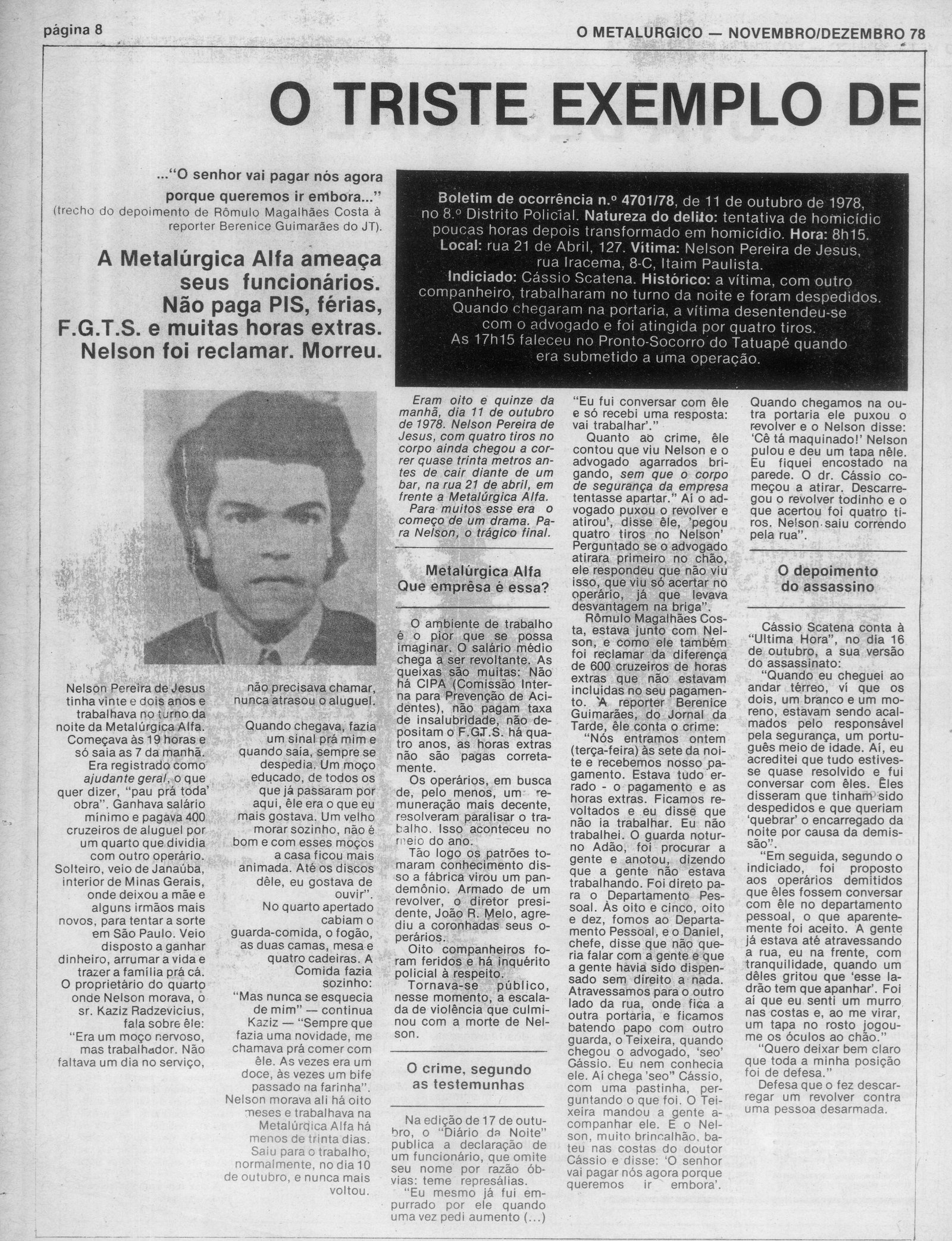 Já Nelson Pereira de Jesus, poderia ter encontrado outro trabalho, poderia ter se tornado sindicalista, poderia ter estudado e mudado de profissão, poderia ter tido filhos, família, poderia ter 62 anos em 2019, poderia estar próximo da aposentadoria, mas teve sua vida interrompida por reivindicar seus direitos, aos 22 anos, há quarenta anos atrás.