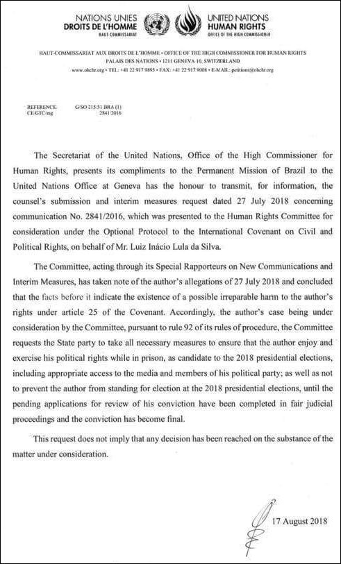 O oficio, assinado pelo Alto Comissariado de Direitos Humanos da ONU, reconhece a existência de violação ao art. 25 do Pacto de Direitos Civis da entidade e a ocorrência de danos irreparáveis a Lula na tentativa de impedi-lo de concorrer nas eleições presidenciais ou de negar-lhe acesso irrestrito à imprensa ou a membros de sua coligação política durante a campanha.