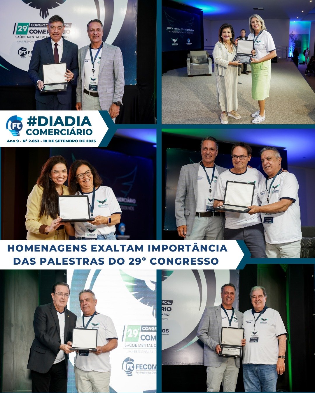 Homenagem aos palestrantes no 29º Congresso Sindical Comerciário destaca a importância da saúde mental no trabalho.