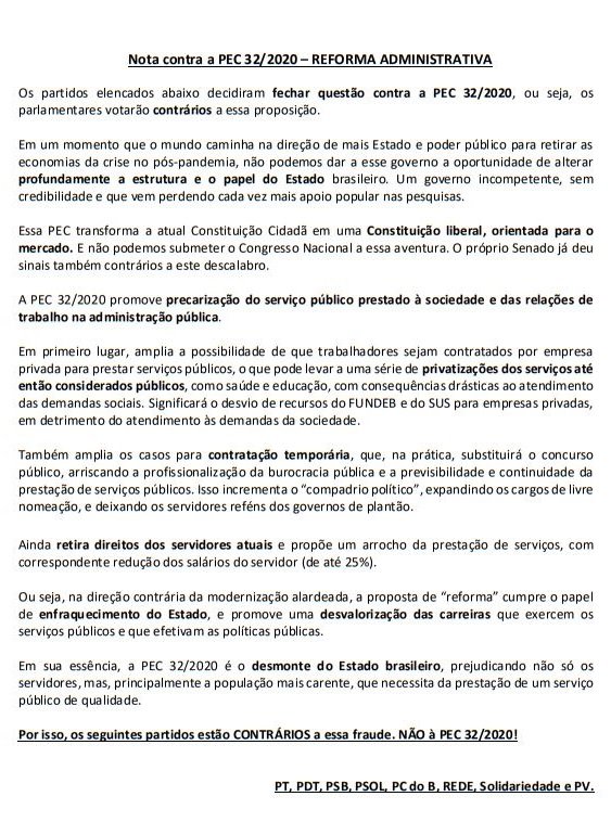 Está escrito na “Nota contra a PEC 32/2020”: “Os partidos elencados [a cima] decidiram fechar questão contra a PEC 32/2020, ou seja, os parlamentares votarão contrários a essa proposição.”