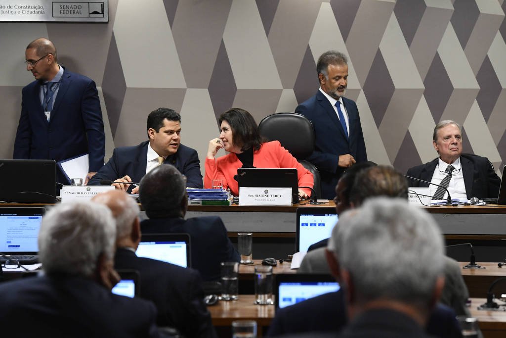 A senadora Simone Tebet (MDB-MS), presidente da Comissão de Constituição, Justiça e Cidadania do Senado, nesta quarta (4), conversa com Davi Alcolumbre (DEM-AP), presidente do Senado; à direita, o senador Tasso Jereissati (PSDB-CE), relator da reforma da Previdência, durante sessão em que as mudanças no INSS foram aprovadas – Marcos Oliveira/Agência Senado