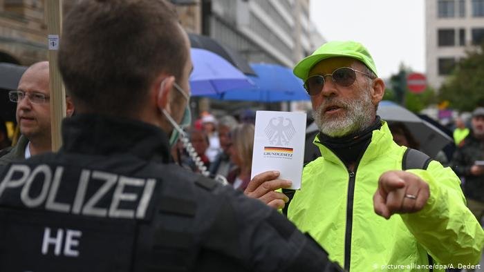 Homem mostra Constituição alemã a policial em protesto contra confinamento, em FrankfurtPicture Alliance/dpa/A. Dedert (DW)