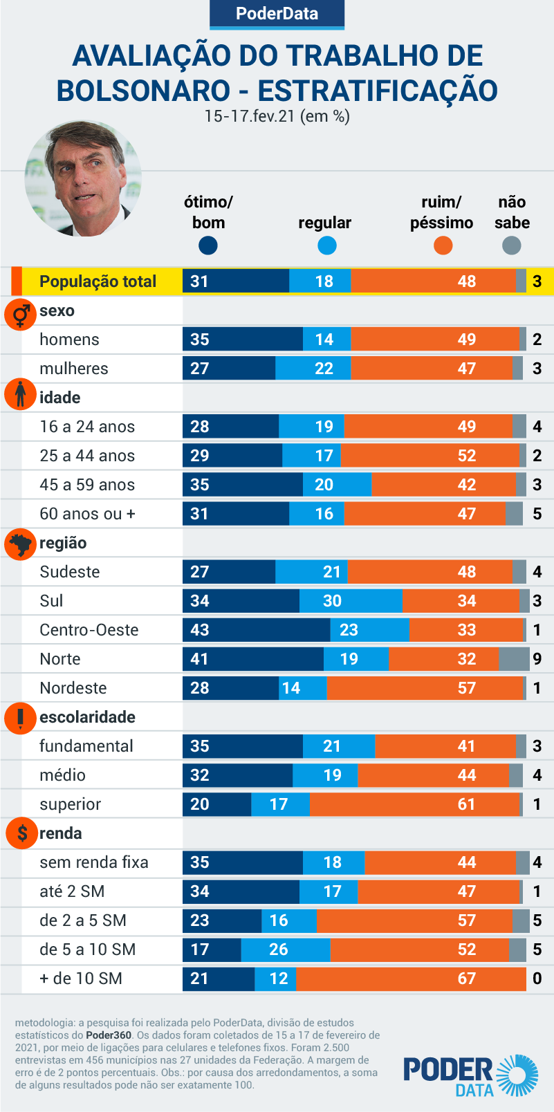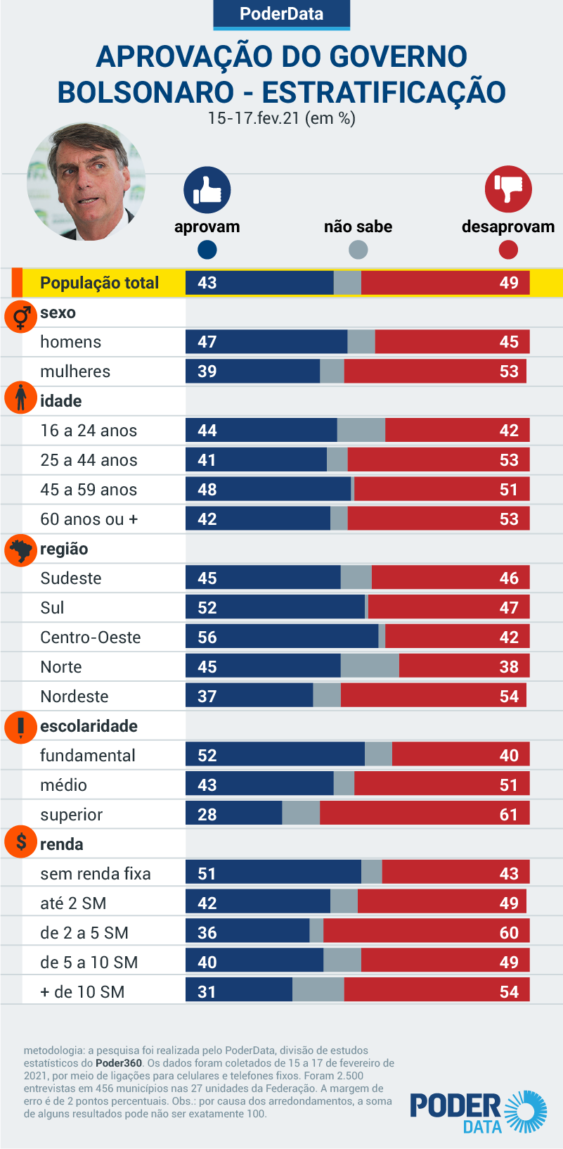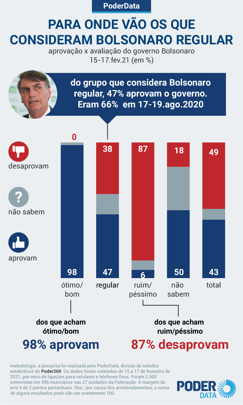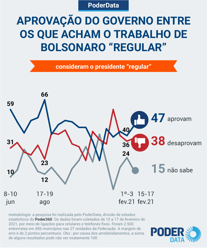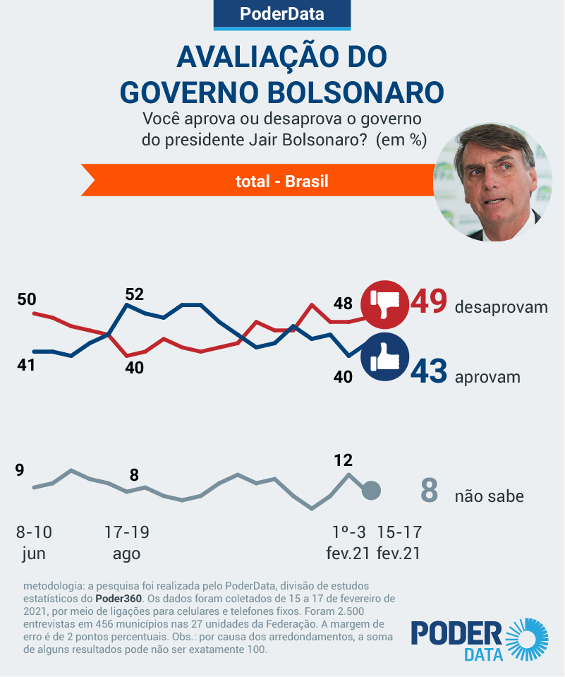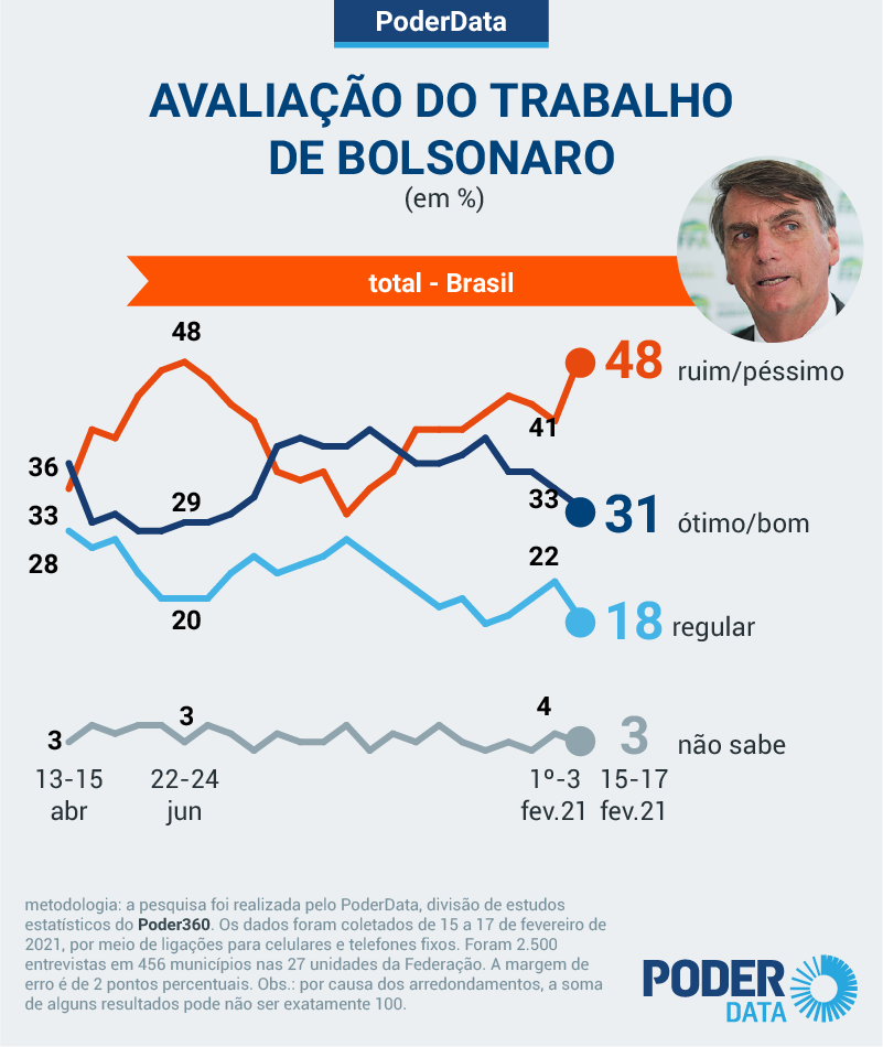 A taxa está 7 pontos percentuais maior do que a de 15 dias, quando a desaprovação era de 41%. O grupo que o avalia como “regular” também caiu: eram 22%; agora são 18%. É o que mostra pesquisa PoderData realizada de 15 a 17 de fevereiro de 2021.