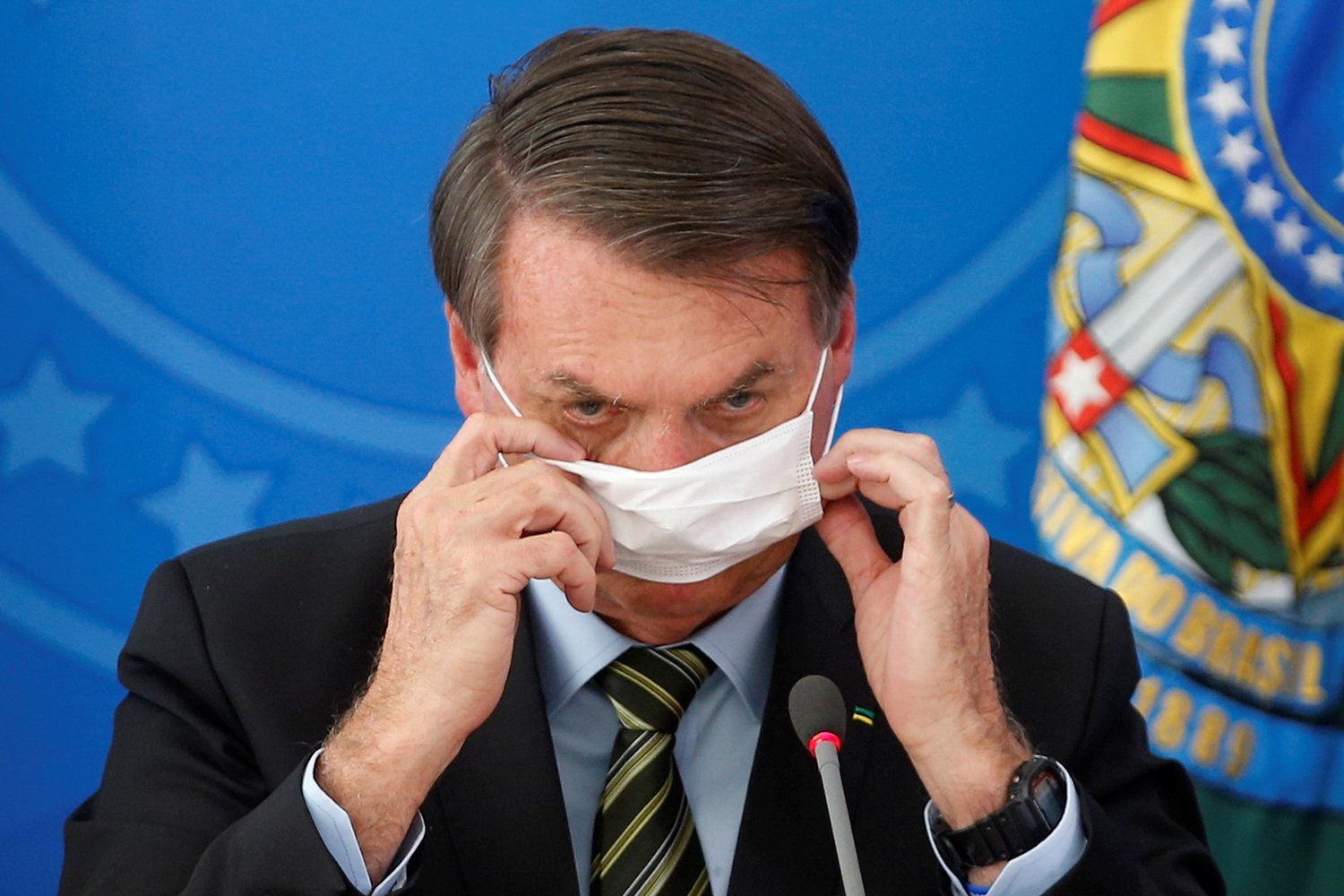 Brazil’s President Jair Bolsonaro wearing a protective face masks reacts during a news conference to announce measures to curb the spread of the coronavirus disease (COVID-19) in Brasilia, Brazil March 18, 2020. REUTERS/Adriano Machado
