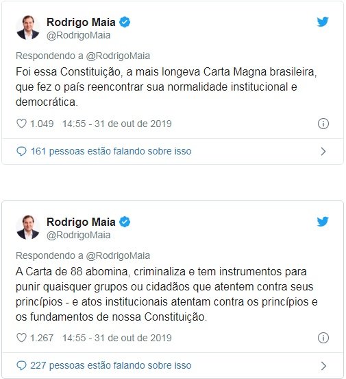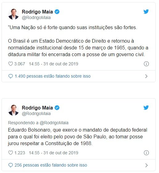 Ao rechaçar as declarações de Eduardo, Rodrigo Maia lembrou que ele exerce o mandato de deputado federal, eleito por São Paulo, e que jurou respeitar a Constituição Federal de 1988 ao tomar posse neste cargo eletivo. “Foi esta Constituição que fez o país reencontrar sua normalidade institucional”, ponderou o presidente.