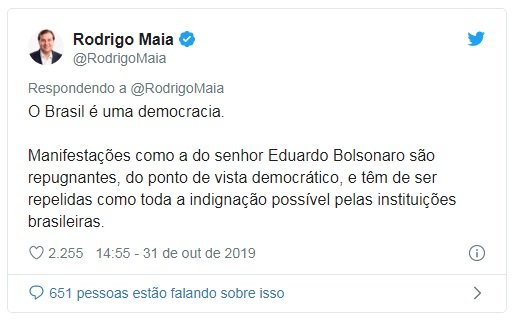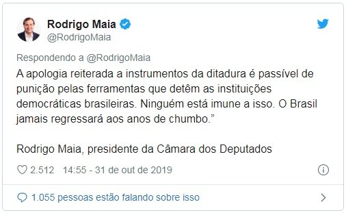 “Manifestações como a do senhor Eduardo Bolsonaro são repugnantes, do ponto de vista democrático, e têm de ser repelidas com toda a indignação possível pelas instituições brasileiras. A apologia reiterada a instrumentos da ditadura é passível de punição pelas ferramentas que detêm as instituições democráticas brasileiras. Ninguém está imune a isso. O Brasil jamais regressará aos anos de chumbo”, concluiu Maia.