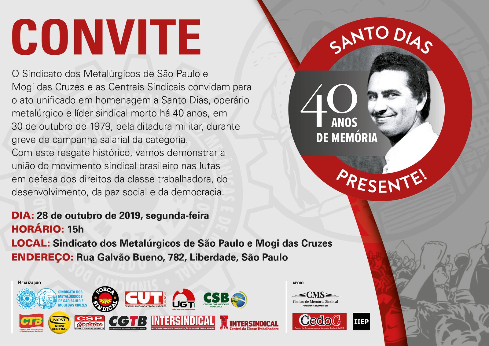 O Sindicato dos Metalúrgicos de São Paulo e Mogi das Cruzes e as Centrais Sindicais convidam para o ato unificado em homenagem a Santo Dias, operário metalúrgico e líder sindical morto há 40 anos, em 30 de outubro de 1979, pela ditadura militar, durante greve de campanha salarial da categoria.