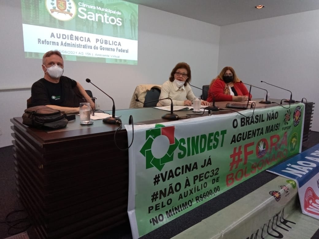 “Os serviços públicos serão exterminados”, disse na audiência o presidente do sindicato dos 12 mil servidores municipais estatutários e 4 mil aposentados de Santos (Sindest), Fábio Marcelo Pimentel.